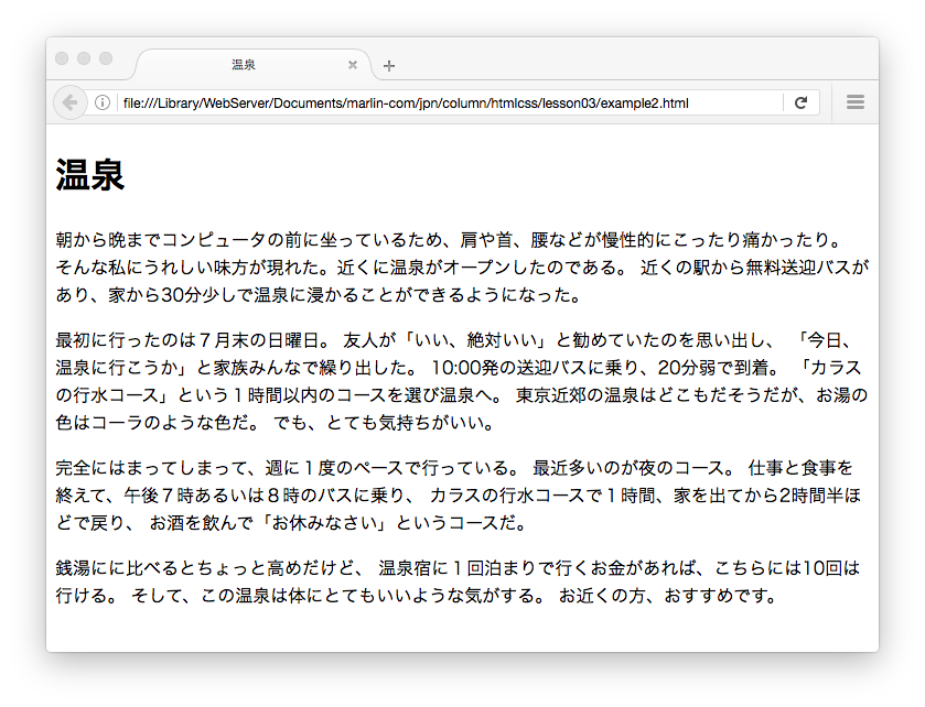第2章の例と同じようにエディタを起動して、リスト3-1のHTML文書を入力し(コピー・ペーストしてもOK)、webpageフォルダの下に、たとえばexample2.htmlという名前でファイルに保存してください。ダブルクリックしてブラウザに読み込むと、図3-1のように表示されるはずです。