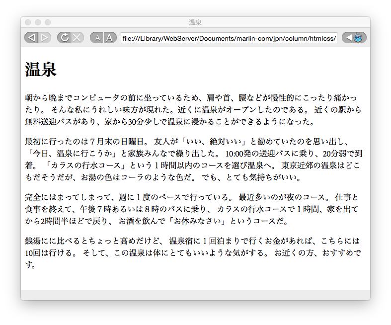 まず、前の例よりももう少し長いHTMLの文書の例を見てみましょう。 図3-1のようなページを作ります。