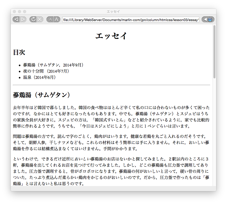 エッセイが3本ほどたまったので、まとめて図3-3と図3-4のような「エッセイのページ」を作ることにしましょう。