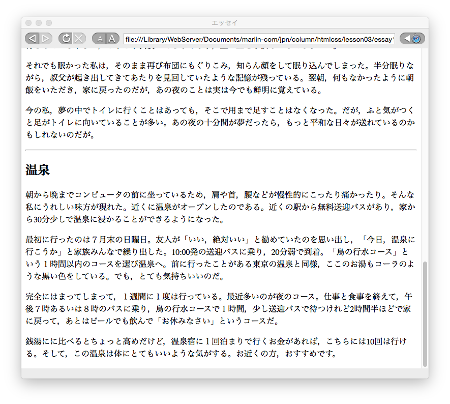 さて、リスト3-2を最後まで見てしまいましょう。19行目の横線の下にはエッセイが3本並んでいます。ここには、とくに新しいタグはありません。<hr>でエッセイの間を区切り、<h2>...</h2>でタイトルを書き、<p>...</p>で段落を区切っています。