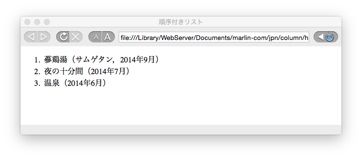 次の例のように、<ul>の代わりに<ol>(Ordered List、順序付きリスト)を使うと、図3-5のように番号がつきます。リスト3-2の例では目次で用いたので番号を付ける必要はない(意味がない)ので<ul>を使いましたが、たとえば好きな順に並べるとすれば番号を振ってもよいでしょう。