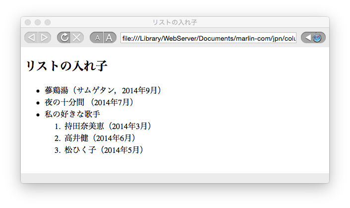 上の例では、列挙される項目を空白文字を使って字下げ(indent)して、構造をわかりやすくしています。<ul>...</ul>の中に<ol>... </ol>が入っている形になっていますので、字下げしておくと全体の構造がよくわかります。
