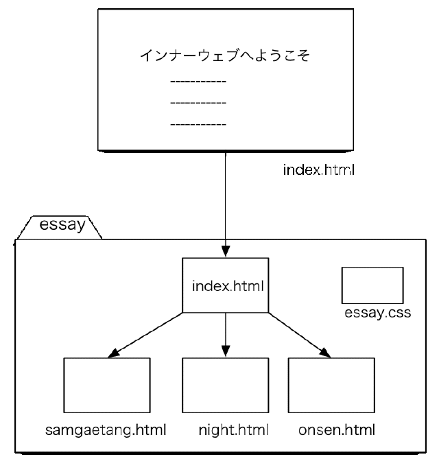 エッセイのそれぞれをファイルに分けるとファイルの数が増えますし、今後エッセイを増やしていくことも考慮してessayというフォルダを新たに作りそこにまとめておくことにしましょう。全体の構成を図5-1のようにします。essayというフォルダの下に、3本のエッセイsamgaetang.html、night.html、onsen.htmlの3つのファイルを置きます。さらに、このフォルダの中には、エッセイの目次を書くindex.htmlというファイルも新たに作ることにします。上の階層にあるindex.htmlはサイト全体の目次、フォルダessayの下にあるindex.html(essay/index.html)はエッセイに関する目次です。