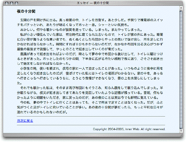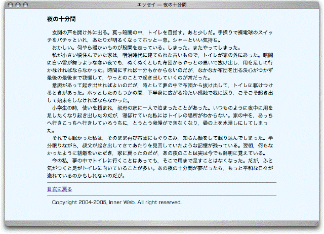 この結果、最後の著作権表示の段落を表示するときにはcopyrightというクラスのスタイルが適用されることになります。これにより、night.htmlなどのページの表示結果は図5-5とまったく同じになります。そして、フォントのサイズをもっと小さくしたいとか、色を目立たないように薄いグレーにしたいといった場合は、essay.cssのファイルのcopyrightの定義だけを変更すれば、すべてのページのスタイルが変わってしまうのです。