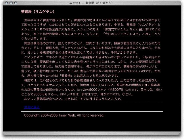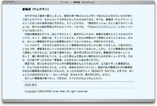 同じようにして、samgaetang.htmlとonsen.htmlにもessay.cssを利用するよう指定します。すると、この2つについても、図5-3のように図5-2と同じような見栄えのページができあがります。