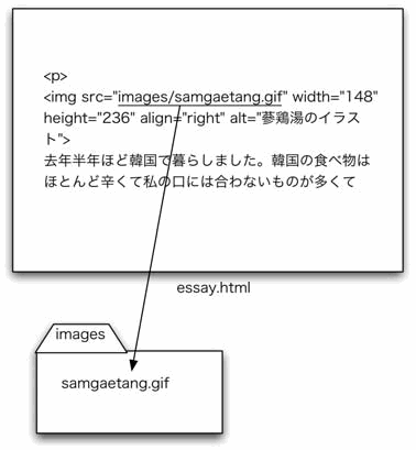 画像の指定にも相対指定と絶対指定があります。 images/samgaetang.gifのように指定した場合は、そのHTMLファイルを基準にして、imageというサブフォルダにあるsamgaetang.gifというファイルを参照します。http://www.xxx.com/yyy.gifのように画像のアドレスを指定することもでき(絶対指定)、その場合はそのアドレスにある画像が表示されます。この方法を使うと、いろいろなページ(たとえば好きな歌手のホームページ)にある画像をいかにも自分が作ったかのごとく自分のページで表示できてしまいます。しかし、他人の画像や文書を自分のページで使うときには、了承を得て行わなくてはいけません。著作権を侵害しないよう注意しましょう。