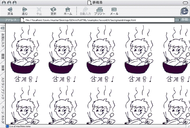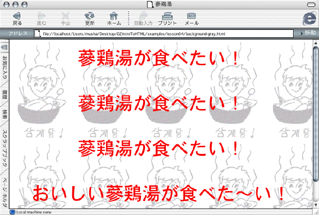 同じように他のタグにスタイルでbackground-imageを指定すると、そのタグで囲まれた部分の背景に指定した画像を表示することができます。 たとえば、<p style="background-image: url(samgaetang.gif);"> ...</p> とすると、その段落の背景にだけ画像が表示されることになります。