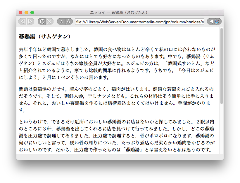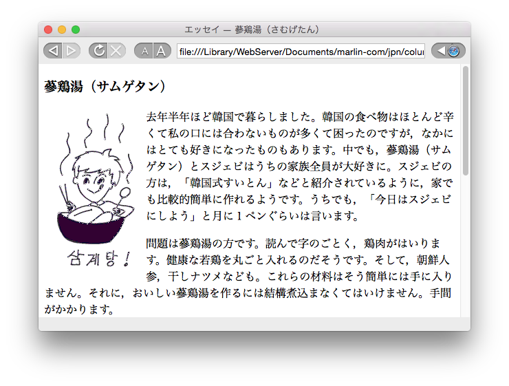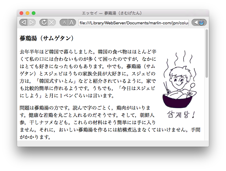 前の章で作ったのエッセイのページ(図6-1)に、ちょっとした画像を加えてみましょう。画像は<img>タグを使って指定します。リスト3-2のessay.htmlの蔘鶏湯の本文の頭に画像を入れてみます。