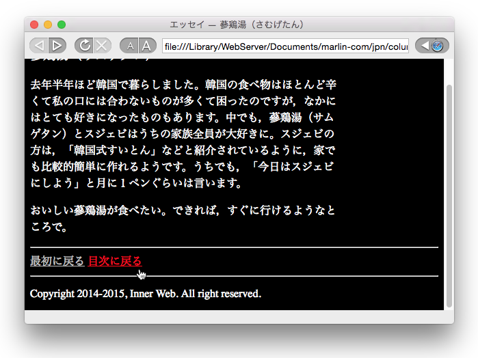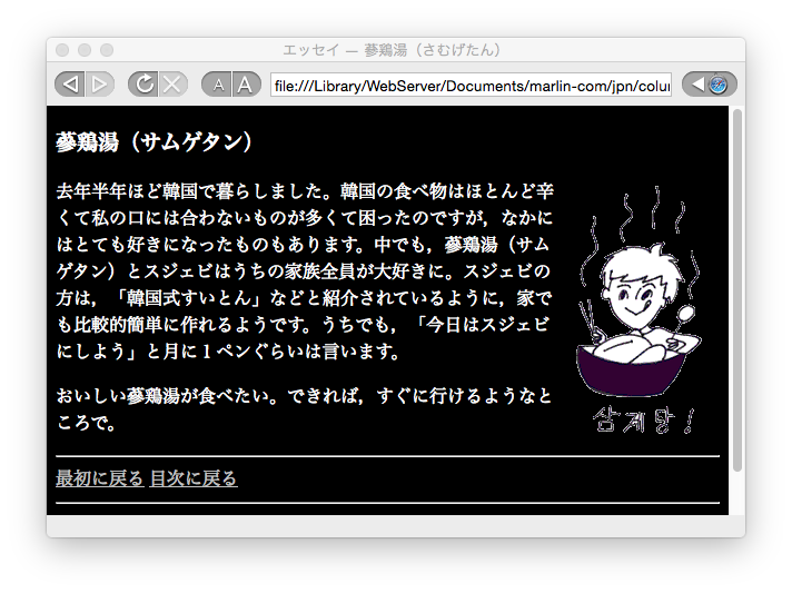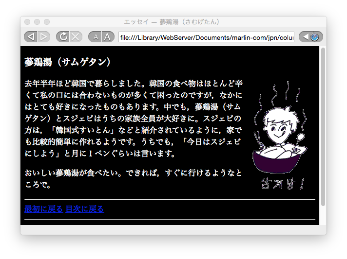 上のコードを指定すると、蔘鶏湯のページは図7-6のように表示されます。リンクをマウスでクリックしようとしているときは、図7-7のようにa:activeで指定した色になります。