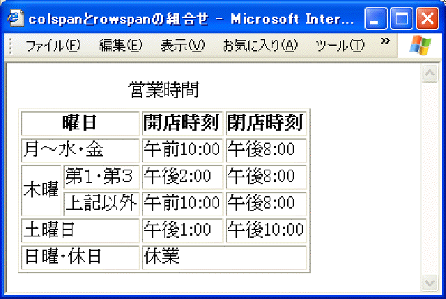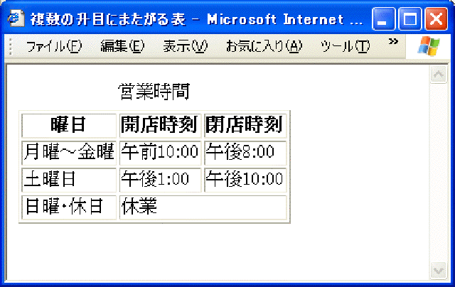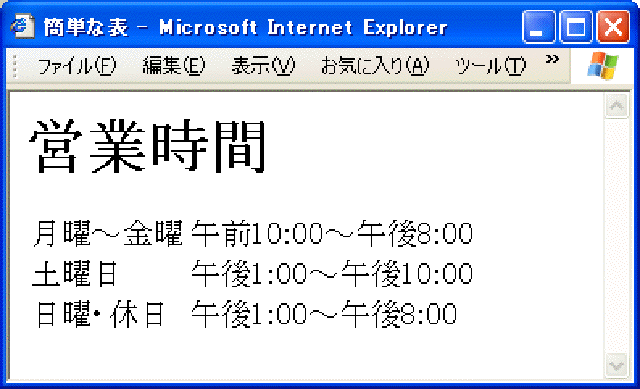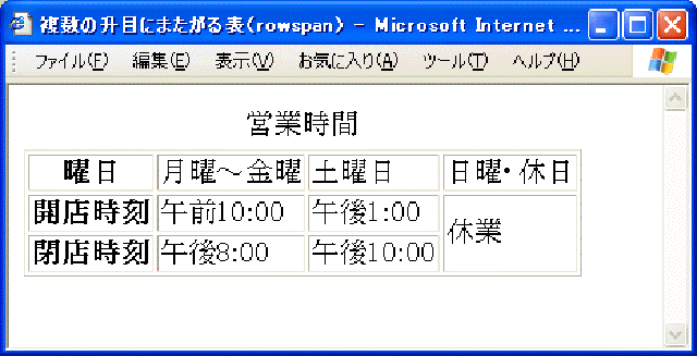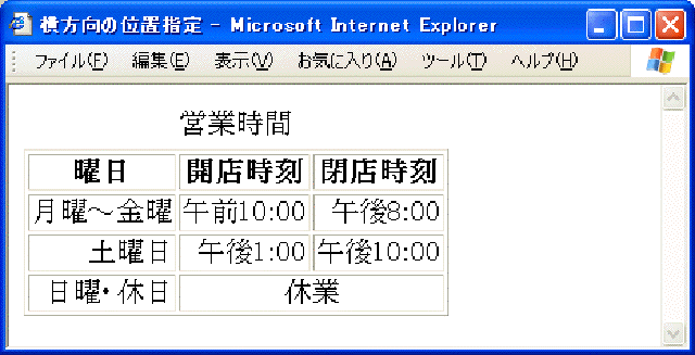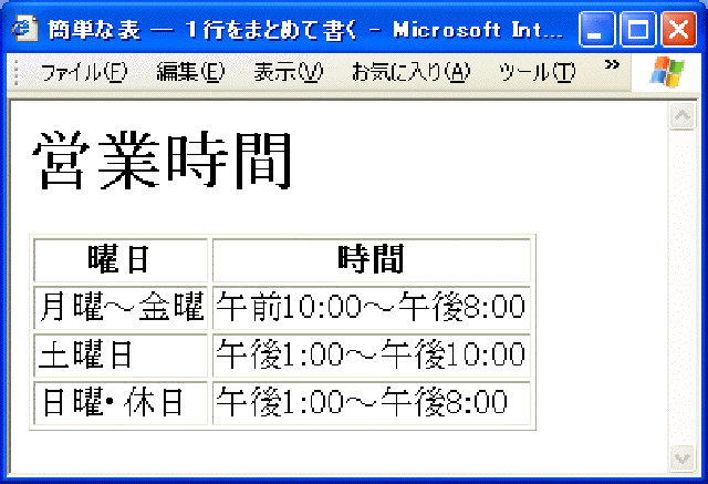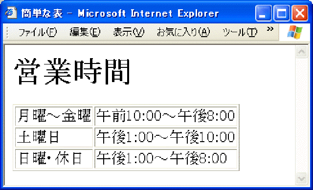 7 <body> 8 <h1>営業時間</h1> 9 <table border="1"> 10 <tr><th>曜日</th> <th>時間</th></tr> 11 <tr><td>月曜〜金曜</td><td>午前10:00〜午後8:00</td></tr> 12 <tr><td>土曜日</td><td>午後1:00〜午後10:00</td></tr> 13 <tr><td>日曜・休日</td><td>午後1:00〜午後8:00</td></tr> 14 </table> 15 </body> 16 </html>