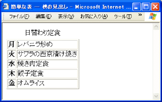 7 <body> 8 <table border="1"> 9 <caption>日替わり定食</caption> 10 <tr><th>月</th><td>レバニラ炒め</td></tr> 11 <tr><th>火</th><td>サワラの西京漬け焼き</td></tr> 12 <tr><th>水</th><td>焼き肉定食</td></tr> 13 <tr><th>木</th><td>餃子定食</td></tr> 14 <tr><th>金</th><td>オムライス</td></tr> 15 </table> 16 </body> 17 </html>