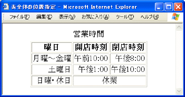 align属性は<tr>タグに指定することも<td>タグに指定することも、そして必要ならば<th>タグに指定することもできます。この例では、11-13行目<tr>タグに指定して、表の2行目から4行目のすべての要素を右寄せ(right)に指定する一方で、「休業」を囲む<td>タグでセンタリング(center)を指定しています。「休業」の部分については、<td>タグに付いているalign="center"の指定がなければそれを囲む<tr>タグの指定align="right"が効いて右寄せになってしまうのですが、より内側にある<td>での指定が有効になってセンタリングされます。