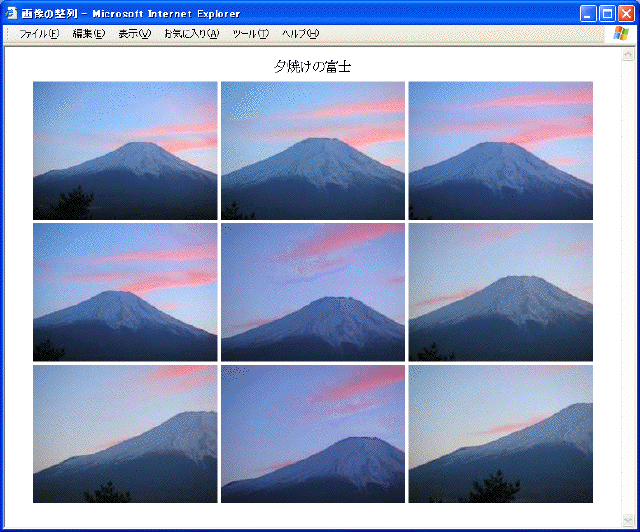 7 <body> 8 <h1 align="center">夕焼けの富士</h1> 9 <table border="0" align="center"> 10 <caption>クリックすると大きな写真が表示されます</caption> 11 <tr align="center"> 12 <td><a href="images-big/no1.jpg"><img border="0" src="no1.jpg"></a></td> 13 <td><a href="images-big/no2.jpg"><img border="0" src="no2.jpg"></a></td> 14 <td><a href="images-big/no3.jpg"><img border="0" src="no3.jpg"></a></td> 15 </tr> 16 <tr align="center"> 17 <td><a href="images-big/no4.jpg"><img border="0" src="no4.jpg"></a></td> 18 <td><a href="images-big/no5.jpg"><img border="0" src="no5.jpg"></a></td> 19 <td><a href="images-big/no6.jpg"><img border="0" src="no6.jpg"></a></td> 20 </tr> 21 <tr align="center"> 22 <td><a href="images-big/no7.jpg"><img border="0" src="no7.jpg"></a></td> 23 <td><a href="images-big/no8.jpg"><img border="0" src="no8.jpg"></a></td> 24 <td><a href="images-big/no9.jpg"><img border="0" src="no9.jpg"></a></td> 25 </tr> 26 </table> 27 </body> 28 </html>