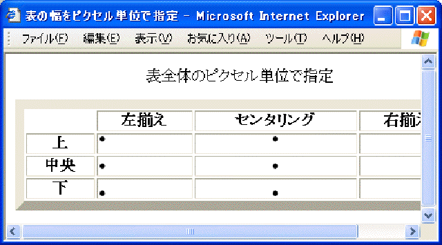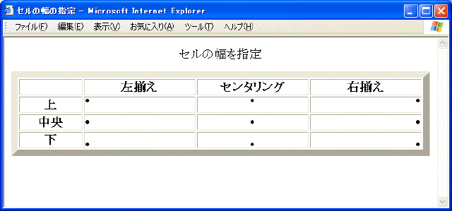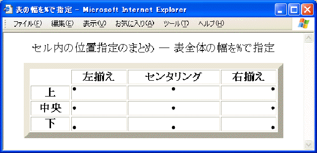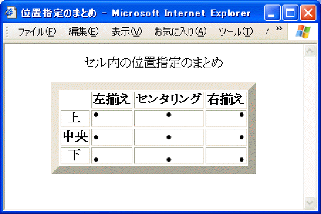 7 <body> 8 <table border="10" align="center"> 9 <caption>セル内の位置指定のまとめ</caption> 10 <tr> 11 <th></th> 12 <th>左揃え</th> 13 <th>センタリング</th> 14 <th>右揃え</th> 15 </tr> 16 <tr> 17 <th>上</th> 18 <td align=left valign=top><img src="images/circle.gif"></td> 19 <td align=center valign=top><img src="images/circle.gif"></td> 20 <td align=right valign=top><img src="images/circle.gif"></td> 21 </tr> 22 <tr> 23 <th>中央</th> 24 <td align=left valign=middle><img src="images/circle.gif"></td> 25 <td align=center valign=middle><img src="images/circle.gif"></td> 26 <td align=right valign=middle><img src="images/circle.gif"></td> 27 </tr> 28 <tr> 29 <th>下</th> 30 <td align=left valign=bottom><img src="images/circle.gif"></td> 31 <td align=center valign=bottom><img src="images/circle.gif"></td> 32 <td align=right valign=bottom><img src="images/circle.gif"></td> 33 </tr> 34 </table> 35 </body> 36 </html>