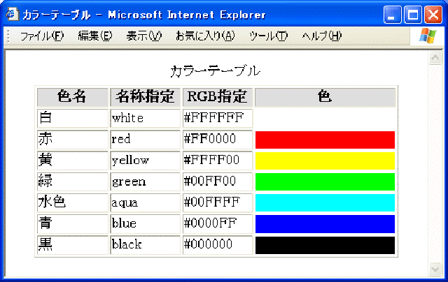 <th width="20%" >RGB指定</th> <th width="40%" >色</th>