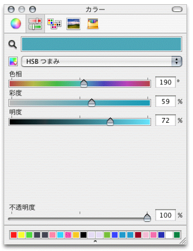 - HSB方式―人間による色の認識をモデル化したもの。Hue(色相、色そのもの)、Saturation(彩度、鮮やかさ)、Brightness(明度、明るさ)を指定する。
