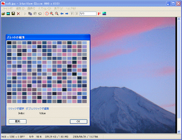 図10-2はIrfanView32というWindowsのアプリケーションでGIF画像を開いて、そのカラーマップを表示したものです。この画像では小さなウィンドウに表示された256の色が使われています。