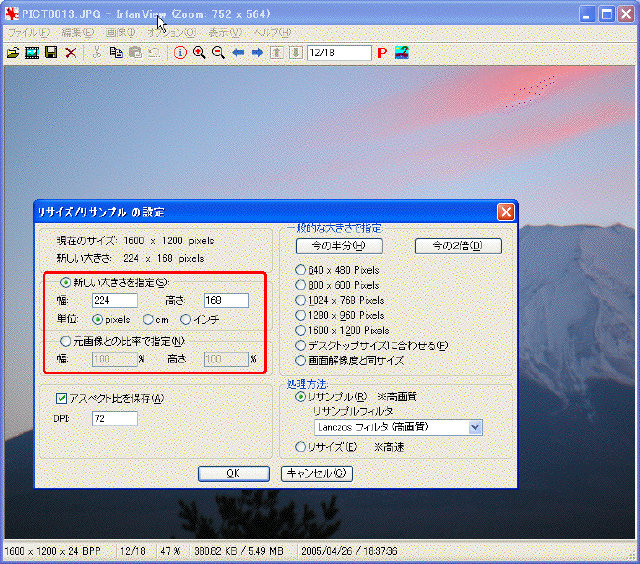 たとえば、IrfanView32では[画像]メニューの[リサイズ/リサンプル]という項目を選択すると、図10-3のようなダイアログボックスが表示されるので、画像の大きさをピクセル単位で指定したり、オリジナルの画像との割合で指定したりして、[OK]をクリックすると変更された大きさの画像になります。