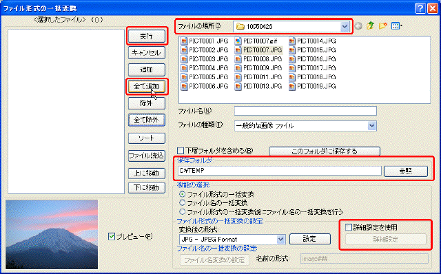「一括変換」を行うには[ファイル]メニューの[一括変換形式/名前]を選択します。図10-4のようなダイアログボックスが選択されますので、画像のあるフォルダに移動し、変換したいファイルを選択します。サイズ変更後のファイルを置くフォルダは[参照]ボタンを押して指定しておきます(この例ではC:¥TEMPを指定しています)。