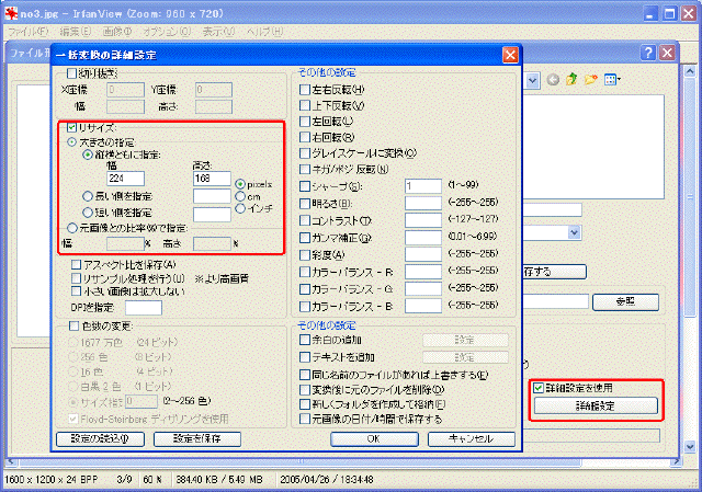 JPEG形式では「圧縮率」を変えて画像を保存することができます。IrfanView32の場合、[ファイル]メニューから[名前を付けて保存]を選択し、表示されるダイアログボックスの下部中央にある[設定ダイアログを表示]の項目を選択すると、[JPEG/GIF保存設定]という小さなウィンドウが表示されます。ここで[保存画質]を選択することができます。この数値を90とか80とかに設定すると、それほど質を落とさずにファイル容量をかなり小さくできます。それほど質にこだわらない写真ならば50程度にしても大丈夫でしょう。あまり、画質を落とすと画像全体に縞模様が出てしまいますので注意が必要です。