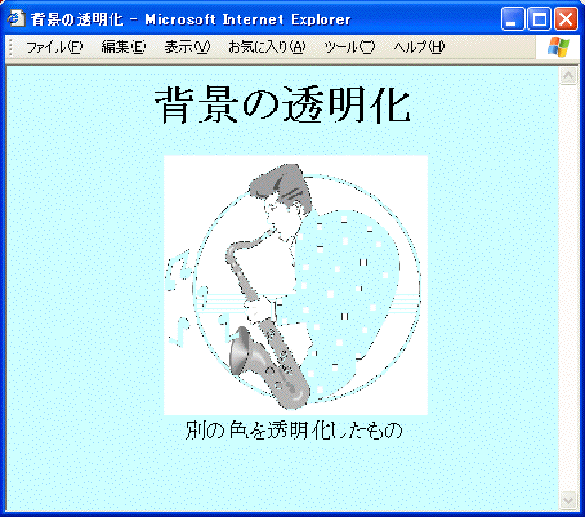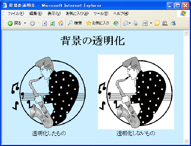 透明な背景を持つ画像とは、もとの画像に現れる色のうちからひとつを選んでそれを「透明(transparent)」にしたものです。そのファイルをウェブページ上で表示すると、指定した色を持つ部分の下に隠れてしまうはずのものが透けて見えるわけです。これによって、画像が浮き上がるような印象を与えることができます。たとえば、図10-7は、背景が透明な画像と背景が透明でない(普通の)画像を並べた例です。このページでは、ページ全体の背景を水色にしていますので、左側の図の背景も水色になっています。