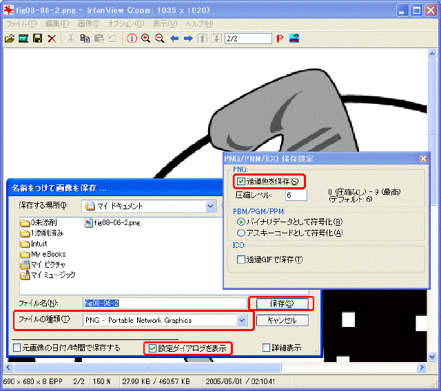 背景が透明化できるのはGIFあるいはPNG形式のファイルです。たとえばIrfanView32の場合、[ファイル]メニューの[名前を付けて保存]を選択し、図10-8の左下のように[ファイルの種類]を[GIF]あるいは[PNG]に設定し、[設定ダイアログを表示]をチェックしておいて[保存]をクリックすると、図10-9のように[透明色を選択]のウィンドウにオリジナルの画像が表示されて、透明にするべき色(部分)を指定できます。たとえば、この図の例では白い部分をクリックすると、その部分が透明化されます。