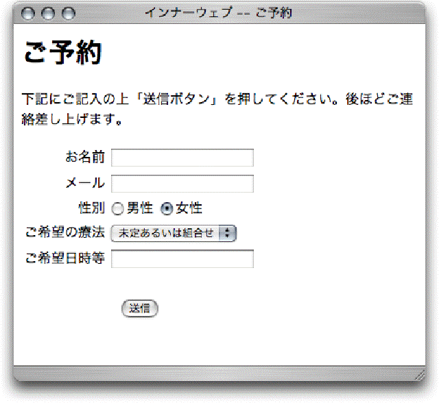 1 <!DOCTYPE html> 2 <html> 3 <head> 4 <meta charset="utf-8"> 5 <title>インナーウェブ -- ご予約</title> 6 </head> 7 <body> 8 <h1>ご予約</h1> 9 <p> 10 下記にご記入の上「送信ボタン」を押してください。後ほどご連絡差し上げます。 11 </p> 12 13 <form name="contact" method="post" action="<...>"> 14 お名前 <input type="text" name="name"><br> 15 メール <input type="text" name="email"><br> 16 性別 <input type="radio" name="sex" value="male">男性 17 <input type="radio" name="sex" value="female" checked>女性<br> 18 ご希望の療法 19 <select name="kind"> 20 <option value="seitai">整体</option> 21 <option value="ashiura">足裏マッサージ</option> 22 <option value="kikou">気功</option> 23 <option selected value="etc">未定あるいは組合せ</option> 24 </select> 25 <br> 26 ご希望日時等 <input type="text" name="time"><br><br> 27 <input type="submit" name="submit" value="送信"> 28 </form> 29 30 </body> 31 </html>