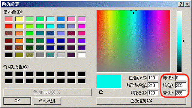 | 図1-1 RGBという方式の色の指定法(赤丸部分)。 0, 255, 255で「水色」を表す |