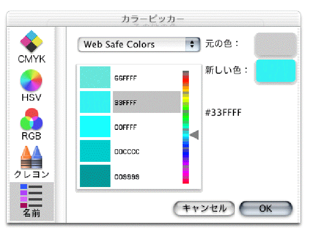 同じ水色を表すのに, RGBでは(0, 255. 255)の3つの数字の組を使うのに対して, HSBでは(120, 240, 240)という3つの数字の組を対応させています。 したがって, 色を表す数字を見たときには, その数字がどの方式を使ったものかがわからないと, 実際の色も決まらないことになります。