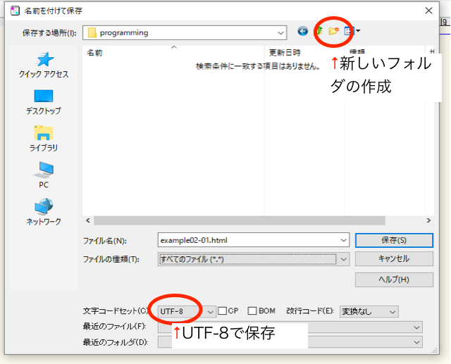| 図1-4a ファイルの保存時にフォルダを作る(Windowsのサクラエディタ)。 |