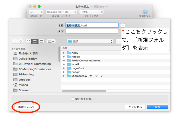 | 図1-4b ファイルの保存時にフォルダを作る(macOSのCotEditor) |
