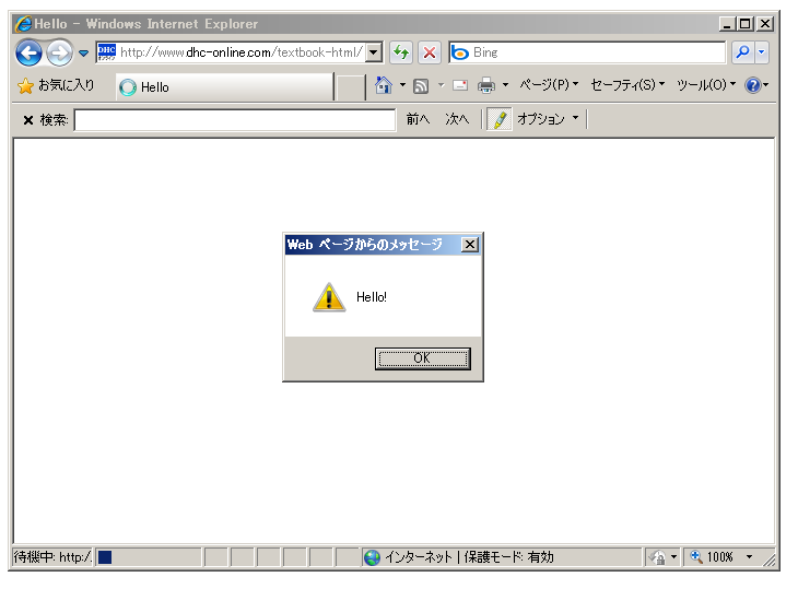 同様に最後の「}」は, 終了タグのようなもので, sayHello()の定義の終わりを示します。 sayHello()の内容は, おわかりでしょう。 alert()はダイアログボックスを表示する関数ですから, 引数として "Hello!" を渡されれば, この文字列をボックス内に表示します。