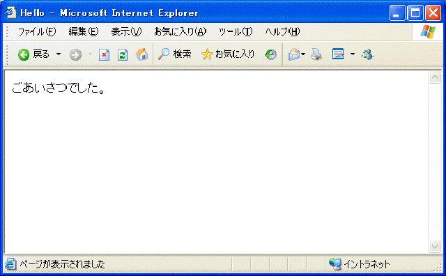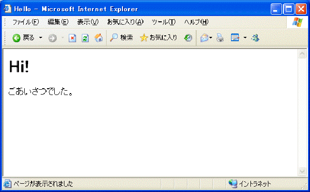- <body>...</body>のあいだの文字列やタグが解釈され, ウィンドウに文字列「ごあいさつです。 」が表示される。