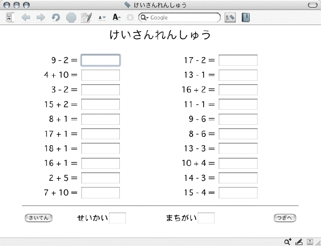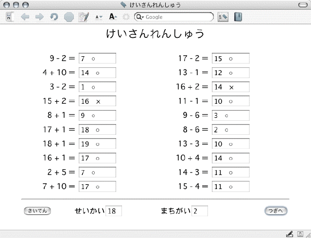 このページを表示すると, 20問の練習問題を2列に並べて表示してくれ, 答えを記入して, [さいてん]ボタンを押すと採点をしてくれます(図8-2)。 また, [つぎのもんだい]ボタンを押すと, 別の問題(20問)を表示します。