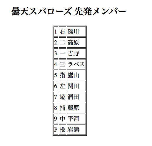 15 <table style="margin: auto;"> 16 <tr><td>1</td> <td>右</td> <td>磯川</td> </tr> 17 <tr><td>2</td> <td>二</td> <td>高原</td> </tr> 18 <tr><td>3</td> <td>一</td> <td>吉野</td> </tr> 19 <tr><td>4</td> <td>三</td> <td>ラベス</td> </tr> 20 <tr><td>5</td> <td>指</td> <td>鷹山</td> </tr> 21 <tr><td>6</td> <td>左</td> <td>関田</td> </tr> 22 <tr><td>7</td> <td>遊</td> <td>酒田</td> </tr> 23 <tr><td>8</td> <td>捕</td> <td>藤原</td> </tr> 24 <tr><td>9</td> <td>中</td> <td>平河</td> </tr> 25 <tr><td>P</td> <td>投</td> <td>岩熊</td> </tr> 26 </table> 27 </body> 28 </html>