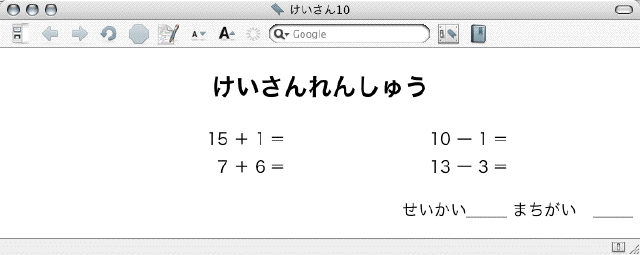 第7章までの「けいさんれんしゅう」では, ダイアログボックスを使って問題を1問ずつ表示しては答えを入力してもらって, ブラウザのウィンドウには簡単なメッセージを書いただけでした。 それなりに計算の練習にはなるでしょうが, 利用者の使い勝手(使いやすさ)を考えると大きな改良の余地がありそうです。