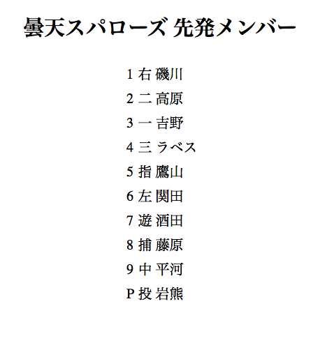 13 <h2 style="text-align:center;">曇天スパローズ 先発メンバー</h2>