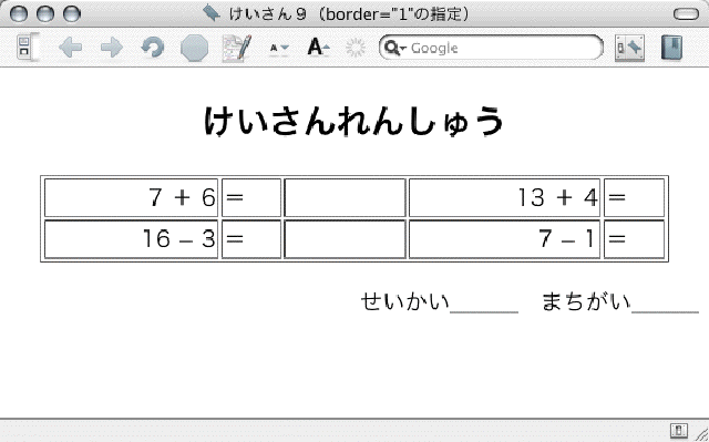 HTML(ウェブページ)の表(テーブル)の本来の使い方は, 上の例のような文字どおりの「表」を作ることですが, これを使って画像や文字列, 入力を受け取るための「フォーム」やボタンなどを思い通りに配置することができます。 ここでも, この整列機能を使って, きれいに計算問題を並べてみましょう。