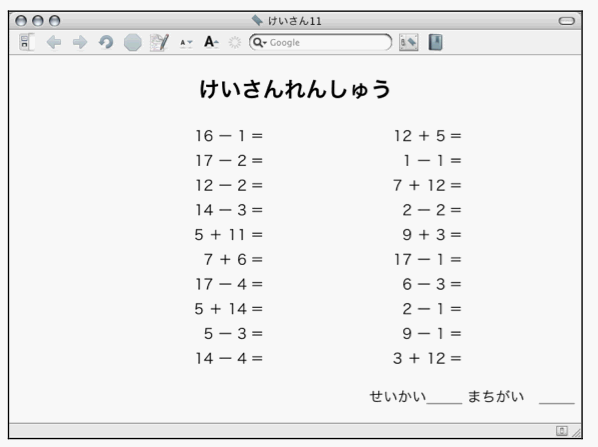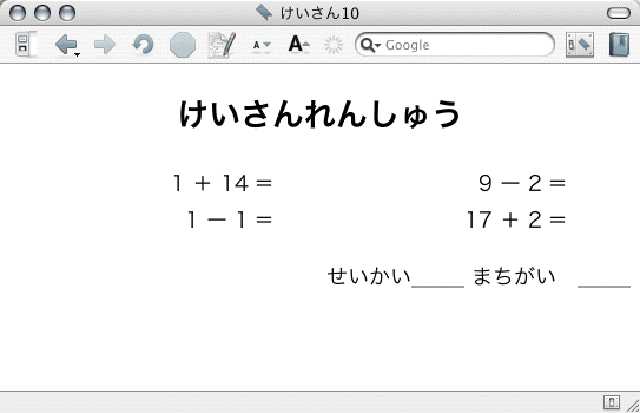 <body> <h2 style="text-align: center">けいさんれんしゅう</h2> <script type="text/javascript"> keisanPrintHyoji(); </script> <p style="text-align; right"> せいかい_____ まちがい _____ </p> </body> </html>
