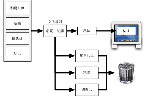 この文法的な情報を使うためには,対応表(辞書)に文法的な情報を入れておくことと,そのことばの文法をパソコンで扱えるような「文法規則」に表現することが必要になります。