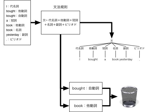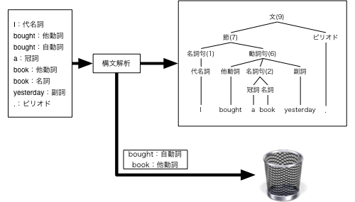 途中で作られた構造には,最終的には使われずに捨てられてしまうものがあります。2.で作られるboughtだけからなる動詞句や6.で作られるI bought a bookからなる節)。この操作によって,品詞や構造の絞り込みを行っているわけです(図3-7)。