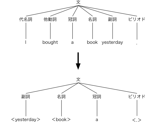 変形操作による木構造の変形によって,ほぼ日本語の訳順を表すようになっています。たとえば,上の英語を順番に日本語に置き換えていくと,「私昨日1つの本買った」という,日本語を学習し始めたばかりの外国人のような日本語になります。