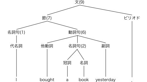 - 1.でできた名詞句(I)と5.でできた動詞句(bought a book yesterday)で節(I bought a book yesterday)ができます(文法2の(7)).