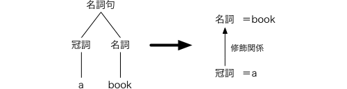 名詞句(a book) ← 冠詞(a)+名詞(book)