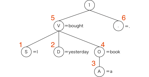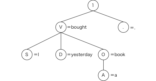 一番上にくるのは「1」のノードです(ノードとは木構造の節の部分のことをいいます)。このノードは全体を束ねるためにあるものです。その下に動詞boughtに対応する Vノードと,最後のピリオドを表す「.」ノードがきています。さらに,その下に,主語(Subject)になるIに対応するSノードと時を表す副詞(aDverb)のDノード(yesterday),そして目的語(Object)を表すOノード(book)がついています。このVノードとその下にあるノードを見れば,この文の骨格が表現されていると言えます。一般的によくいわれるところの5W1H(の一部)が表現されているといってもよいかもしれません。この文の登場人物はIとbookであり,したことはboughtという行為,そしてそれをyesterdayに行なったというわけです。