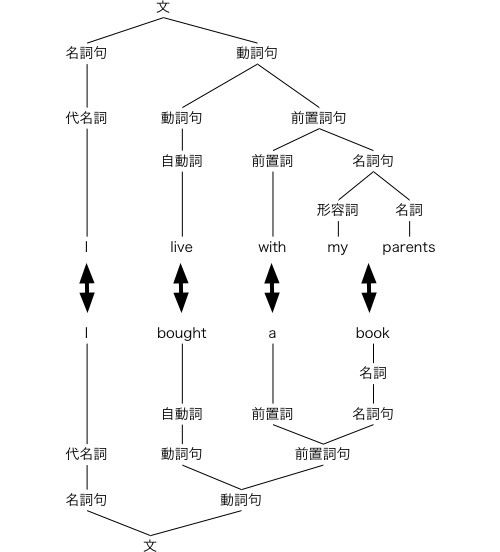 図3-11 I live with my parentsとI bought a bookの構文の比較