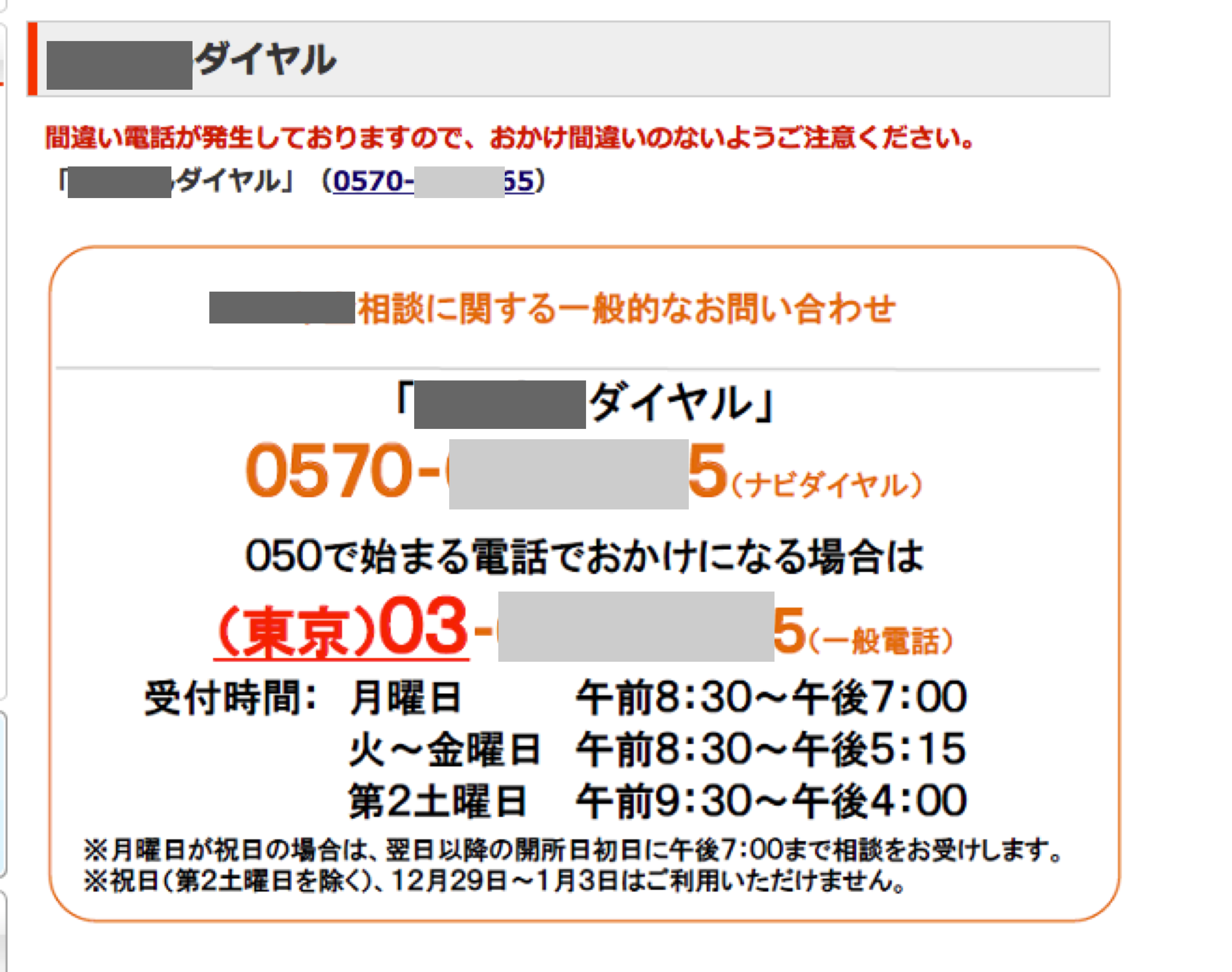 図1: 携帯から電話をかけたり、住所録やカレンダーに登録しようと思っても、文字情報が全部画像になっているのでコピー・ペーストができない。なお、その後再度アクセスして気がついたのだが、画像の上にある「○○ダイアル」(0570-XX-XXXX)の部分はテキストだった。このテキストのコピー・ペーストは可能だ(だが、私のように気がつかない人もいるだろうから、下の画像を大きな文字にしておくほうが単純だしわかりやすいだろう)。