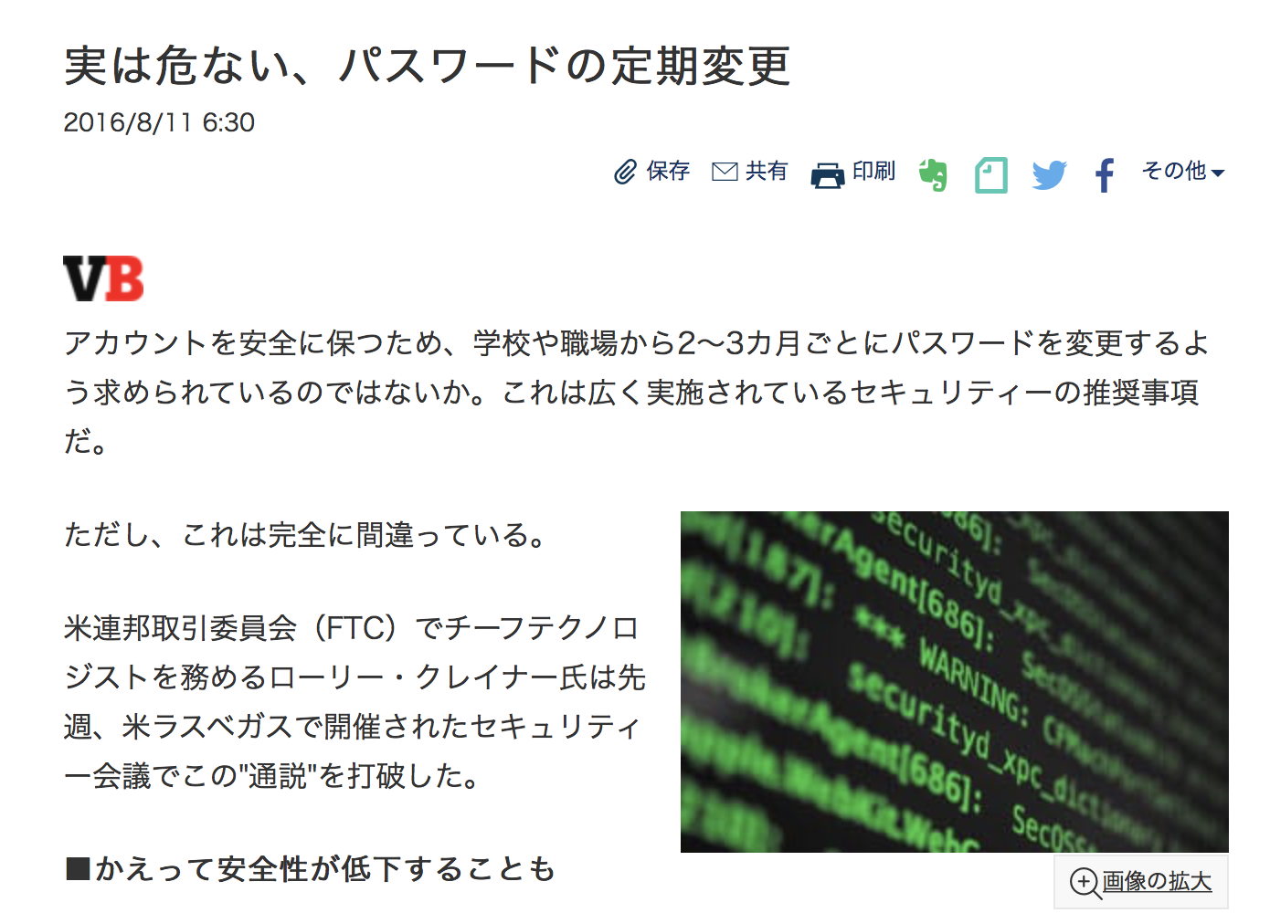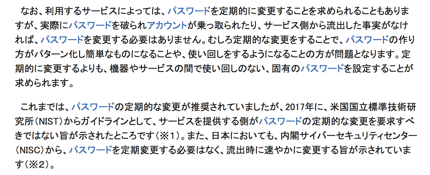 - 「ユーザーに定期的なパスワードの変更を強いることは、セキュリティの低下を招く」と多くのが専門家が考えている。十分安全と思われるパスワードを設定しているユーザーに対して、パスワードの変更を強いることは即刻やめるべきだ