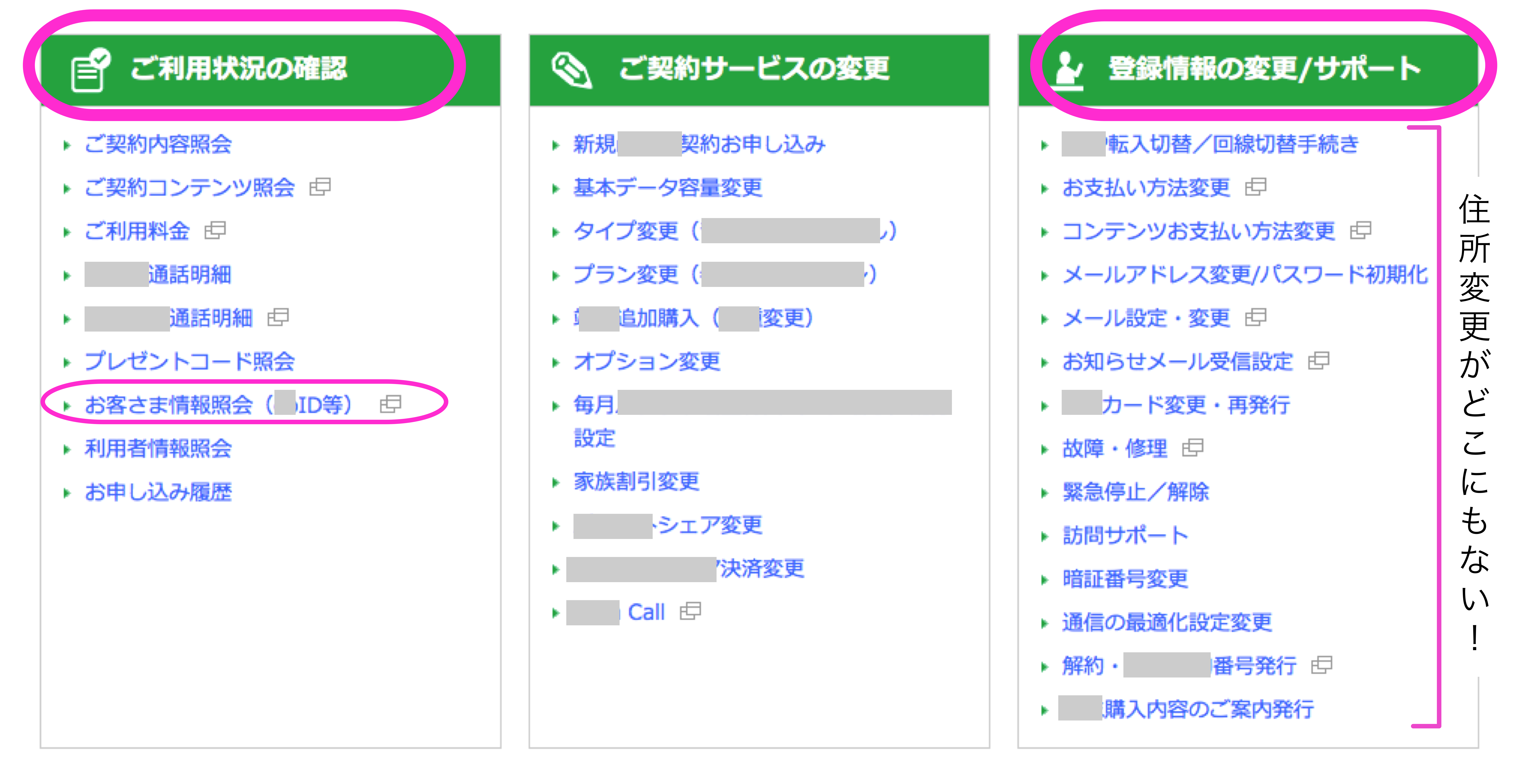 - メニュー項目にウソ、偽りは書くな。「登録情報の変更/サポート」に「住所変更」のページがないなんて、「登録情報の変更」の看板に「偽りアリ」ではないか
