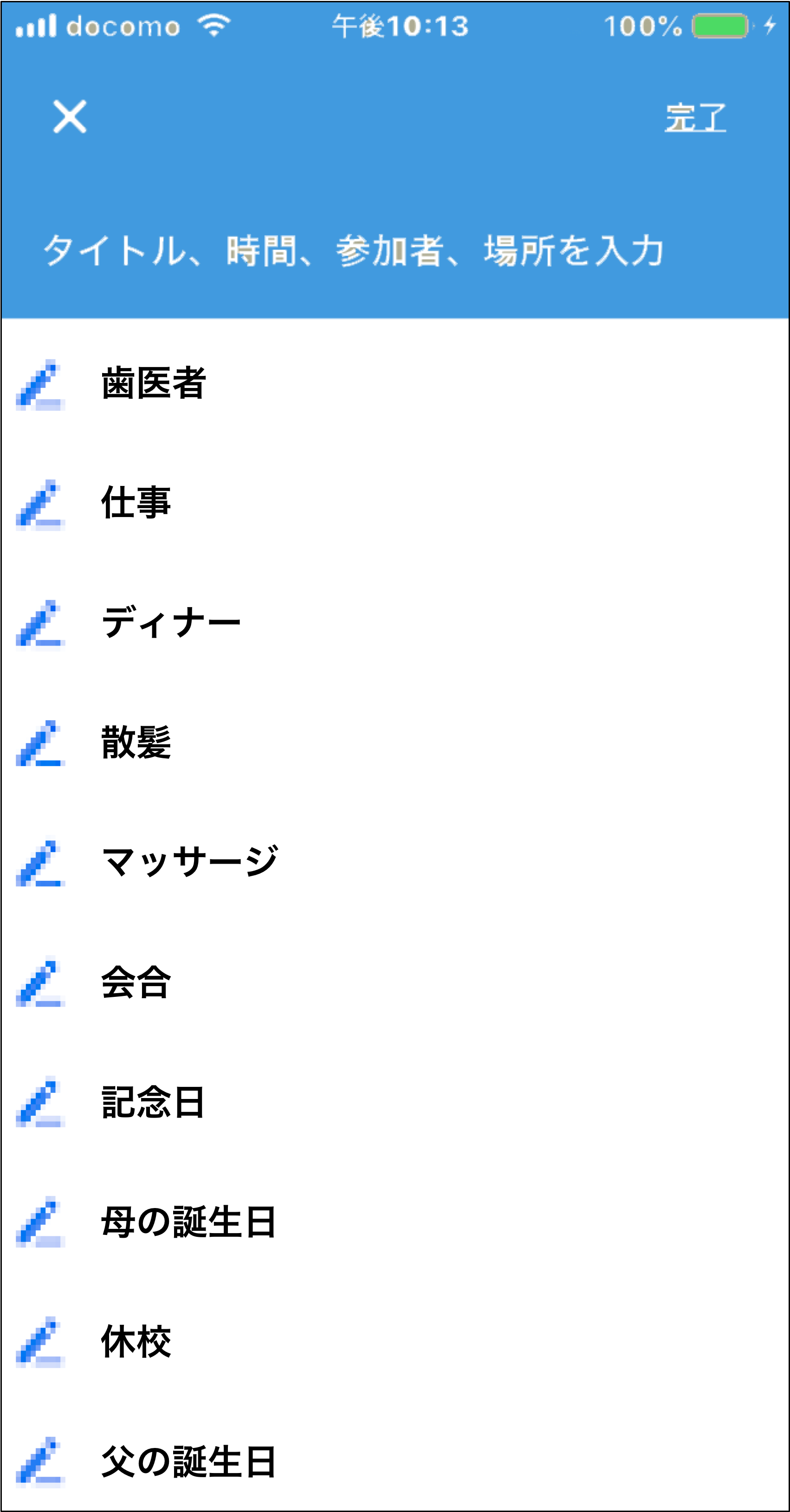 この画面で、「タイトル、時間、参加者、場所を入力」の欄を何度タップしても文字が入力できない。「歯医者」とか「散髪」とか「マッサージ」とか、それほど頻度が高くなさそうな選択肢を選べるだけなのだ。